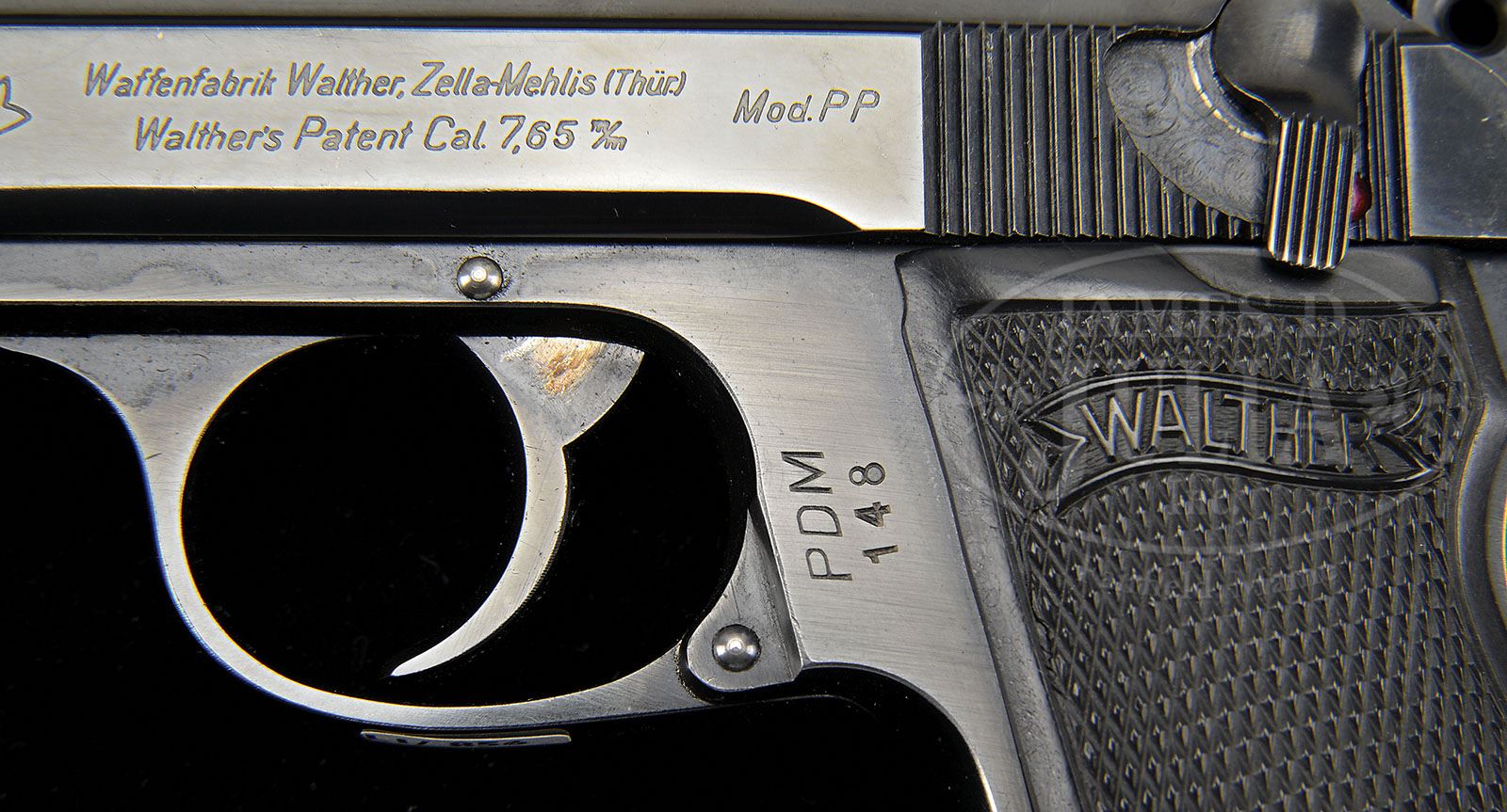*◊ MUNICH POLICE DIRECTORATE “PDM” WALTHER PP. SN 811148. 4″ 7.65mm (32 ACP) bbl. “WALTHER” banner, “Waffenfabrik Walther, Zella-Mehlis (Thur.) / Walther’s Patent Cal. 7.65m/m” and “Mod. PP” on left side of slide. Crown/N proof on right side of slide and right side of bbl visible through ejection port. “PDM/148” (Polizei-Direktion München: Munich Police Directorate, Property Number 148) on left side of frame behind trigger. Bottom magazine release. “WALTHER” banner on top of black plastic wide bordered grips. “WALTHER” banner on bottom left side of original black plastic extended bottom magazine. Numbered parts are matching. Serial number and PDM number are listed on p. 203 of Axis Pistols by Jan C. Still. PROVENANCE: Collection of Dr. Geoffrey Sturgess. CONDITION: Excellent retaining 97% bright original blue. Bore is bright with light wear. Grips are near new with very little wear. Magazine is excellent with 98% blue and an excellent black plastic extension. 4-52615 BWS117 (2,000-3,000)