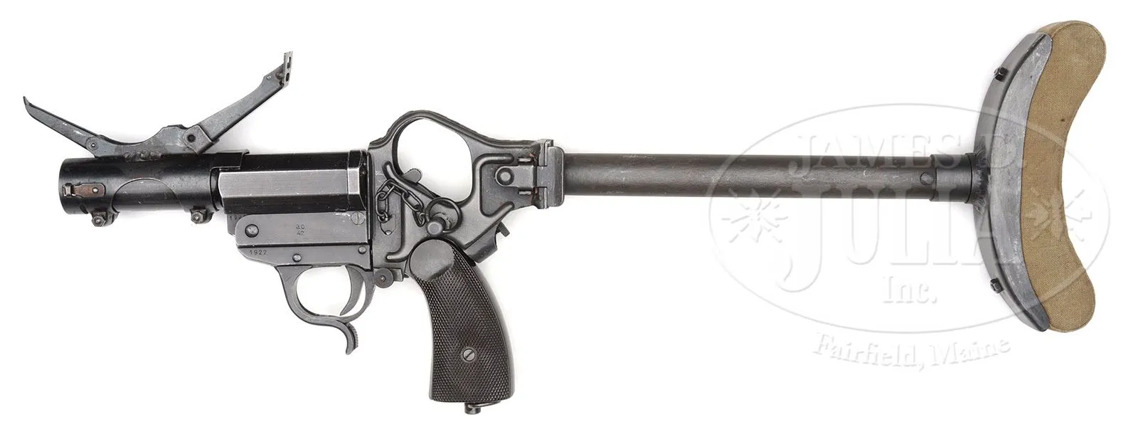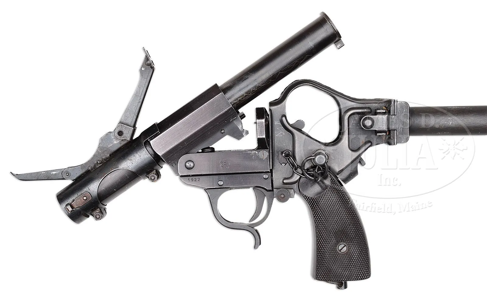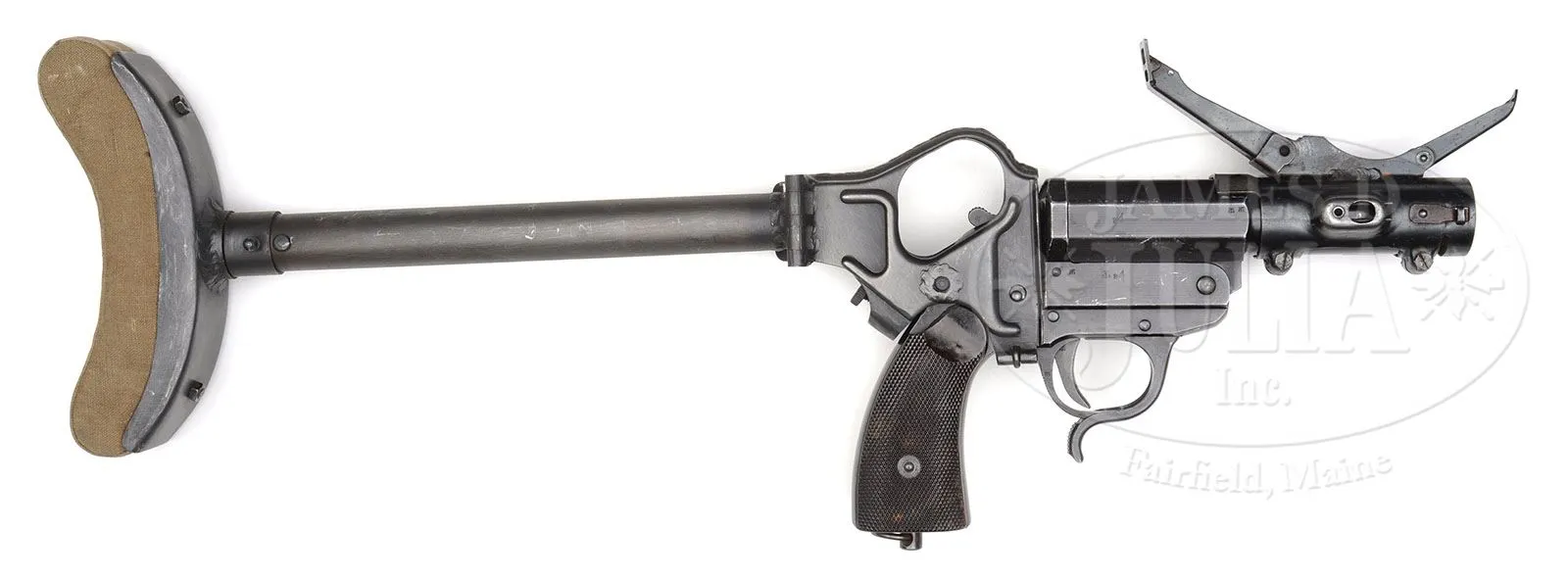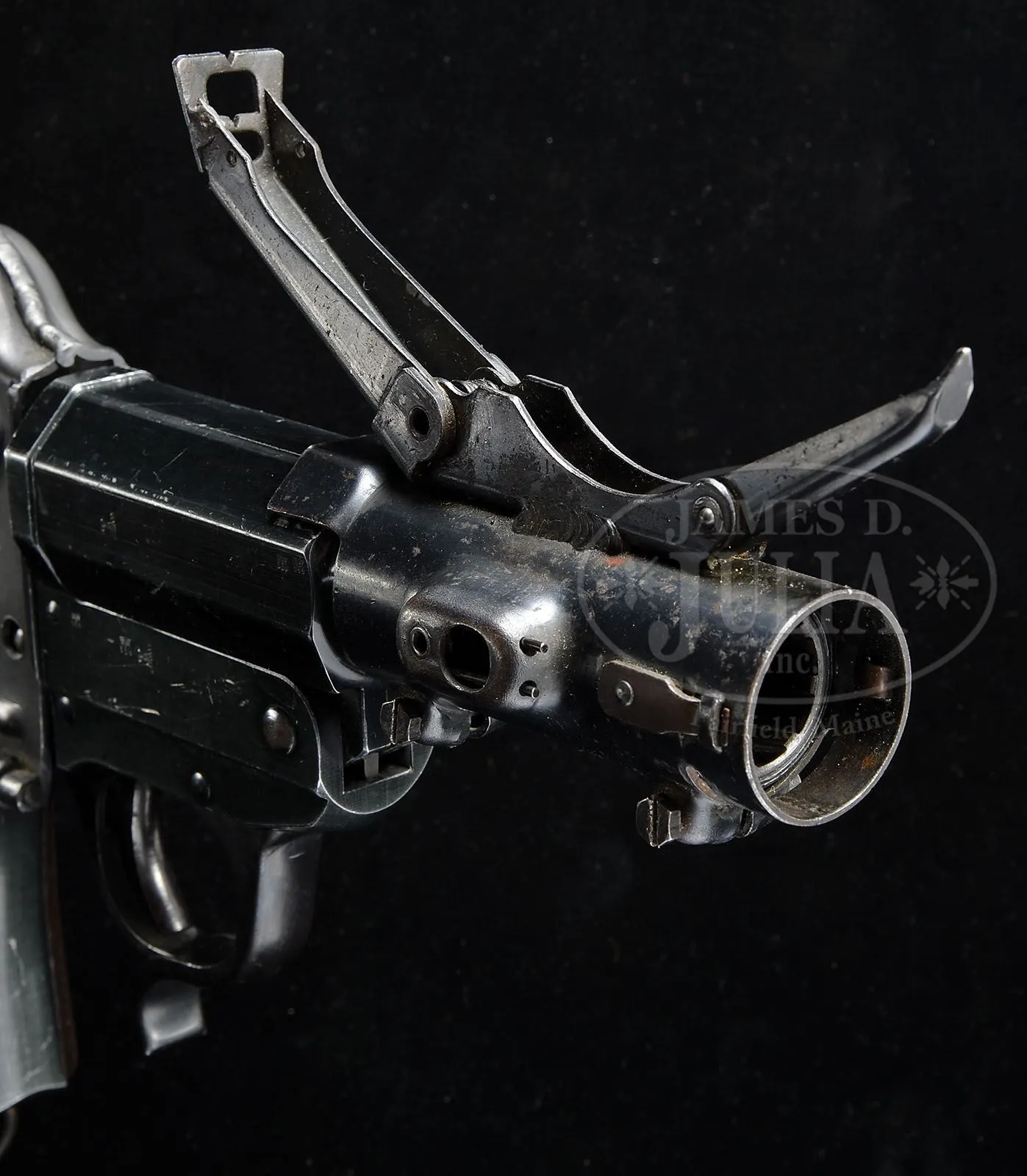 EXTREMELY RARE ANTI-TANK STURMPISTOLE WITH INSERT BARREL, FOLDING STOCK AND FOLDING SIGHT. SN 1922. 27mm 6″ bbl with 22mm rifled anti-tank grenade launcher insert for the shaped charge Panzerwurfkorper 42LP that is “WaA4” proofed, the pistol with special stepped extractor to accommodate both this insert barrel and regular signal ammunition. Oct chamber area has Eagle/359 proofs on upper right corner of right flat. Left side of frame is marked “ac / 42” indicating Walther manufacture in 1942. Frame is Eagle/359 proofed on right side. Serrated Eagle/359 proofed hammer. All numbered parts are matching. Checkered brown plastic grips. With an original unmarked second pattern Sturm pistol folding stock with green canvas padded butt that was required for the recoil of this gun/grenade combination. Stock is unmarked and has a hinge which allows the stock to swivel around to the right side of the gun to make it more compact for travel. It is believed these stocks were manufactured by Loch & Hartenberger in Oberstein. It clamps on the rear of the pistol and is secured with a threaded bolt that has an attaching chain that goes through the large hole in the back of the frame of the gun. A swivel latch secures under the frame behind the trigger guard, and a screw tightens onto the upper backstrap. Orig spring loaded folding sight slides over bbl and secures with two screws. It has a spring loaded closure that accepts a knob on the stock to secure it when in folded position. An original conversion of a Model 1934 Walther flare pistol into an anti-tank grenade launcher. Only about 200 of these sets were made for the German Army in WWII. PROVENANCE: Collection of Dr. Geoffrey Sturgess. CONDITION: Excellent. Gun retains about 95% black finish with wear areas from stock attachment. Bore is sharp. Grips are excellent with sharp checkering. Stock is excellent retaining 97% matte parkerised finish and the green canvas butt pad is excellent with minor wear and light stains. Anti-tank sight attachment retains about 95% blue. 4-52700 BWS133 (10,000-20,000)
