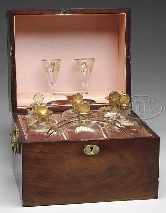 HEPPLEWHITE MAHOGANY SEA CAPTAIN’S LIQUOR CHEST. First quarter 19th century. The figured mahogany box brass bound and with oval brass carrying handles embossed with lion’s masks. The hinged lid opening to an interior fitted with six small matching decanters, all gilt decorated with lozenge stoppers additionally fitted with a matching oval glass tray with scalloped gilt edges. The lid fitted with a pair of matching small stems. Accompanied with its original key. SIZE: 8″ h x 10-1/4″ w x 8-1/2″ d. PROVENANCE: From a fine Maine home. CONDITION: With original polished surfaces and hardware. Decanters, tray and stems also original. Lid with old surface crack otherwise very good. 9-21916 (600-900)