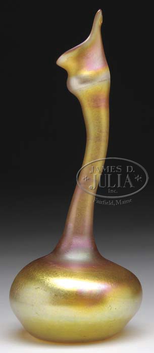 TIFFANY FAVRILE SPRINKLER VASE. Lovely Tiffany goose neck sprinkler vase has slender, curving neck extending from a squat bulbous body and ending in a slightly bulbous sprinkler top. Vase is finished in a bright gold iridescence with strong pink highlights. Signed on the underside “LC Tiffany Favrile W2714”. SIZE: 10″ t. CONDITION: Very good to excellent. 5-63684 (5,500-6,500)