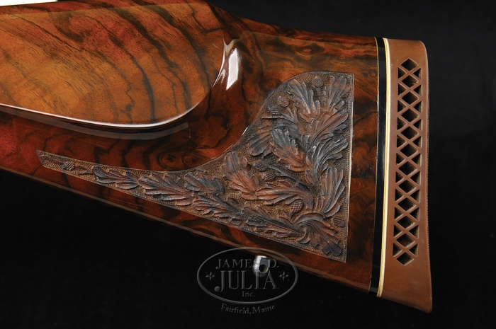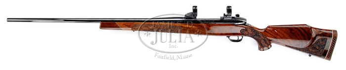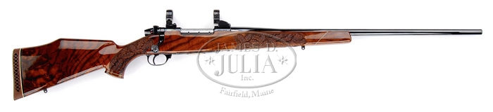 *FABULOUS CUSTOM GRADE WEATHERBY BOLT ACTION RIFLE SN H221837. Cal. 257 WM. #2 contour 26″ bbl high luster blue, checkered bolt knob, damascened bolt and follower, engraved trigger guard and floorplate with gold deer. Super fancy walnut with rosewood forend tip and grip cap, with the #20 carving pattern of oak leaves and acorns. German detachable scope rings and bases. Gun is offered with 32 rounds of factory 120 grain noslers and 18 rounds of factory 87 grain soft point ammo. CONDITION: Extremely fine. Gun has been fired but very little. With the exception of a few finish nicks the gun is nearly as good as the day received in 1990. Comes accompanied with a Weatherby certificate showing shipping to be June 27, 1990. Mechanics are crisp. Bore is shiny. 4-32612 BT29 (3,000-6,000)