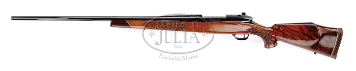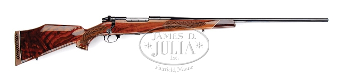*OUTSTANDING CUSTOM GRADE WEATHERBY BOLT ACTION RIFLE SN H209246. Ca. 340 WM. #2 contour 26″ bbl high luster blue, checkered bolt knob damascened bolt and follower, engraved trigger guard and floor plate with gold bear. Fancy walnut with rosewood forend tip and grip cap. #11 intertwined ribbon carving. CONDITION: Very fine. Gun has been fired but with the exception of a few light finish marks and the absence of the Buehler scope mounts it is like the day it was received in 1990. Comes with factory certificate stating ship date of June 27, 1990. Gun comes with 32 rounds of factory 250 grain round nose soft point, 20 round of 250 grain nosler, 18 rounds of 210 grain soft point nosler, and 20 rounds of 200 grain soft point factory ammo. 4-32613 BT30 (3,000-6,000)