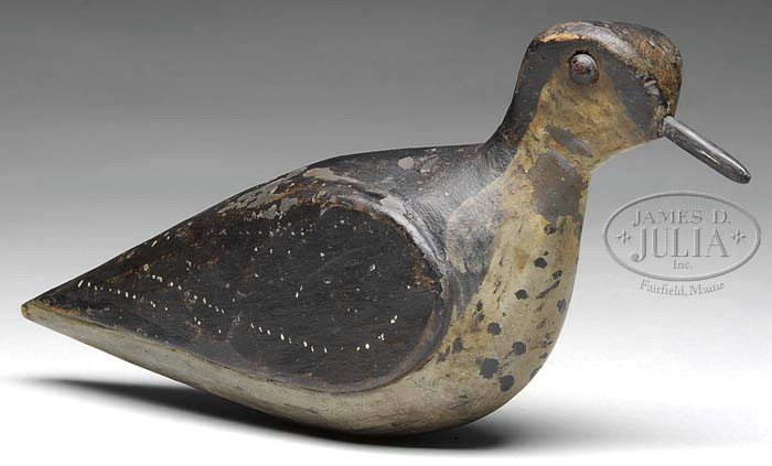 CARVED DECOY OF A PLOVER. Rendered with dark wings with white specks and with a spotted breast and with bead eyes. Drilled for a mounting rod with number “2043” painted beneath the belly. SIZE: 10-1/4″l (overall). CONDITION: Old if not original painted surfaces with flaking to proper right back, area of wing, losses to paint on tail and wear to each side of head above eye. Otherwise good. 9-22718 (800-1,200)