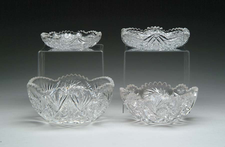 FOUR CUT GLASS BOWLS. Lot consists of two bowls cut in hobstar and cane pattern and two cut in pinwheel pattern. The smallest bowl is signed “Libbey”. SIZE: Vary from 6 in. dia to 8 in. dia. CONDITION: Two of the bowls have roughness to the edges. The remaining is very good. Estate of Edwin Schiebel Sr. 5-60114 (100-200)