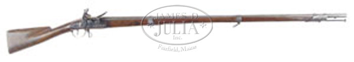 NEW HAMPSHIRE 2ND BATTALION FRENCH MUSKET. French Mod 1766 inf. musket dated (17)73 on the bbl with period armory modifications/repairs: bayonet lug on bottom of bbl (1771), no retaining spring or lower bbl band (introduced in 1773), brass bushing in touchhole. The stock cartouche is a crown over 2 letters, the first a “C”. The side plate is marked “P.F.” and rubbed on the right side of the letters appearing at g lance to be “FI”. Lockplate markings are light, most likely Charleville or Mauberge. Orig. 1766 pattern lock. The bbl is full-length and shows marks on top left breech: “73” indicating date of mfg. & NH battalion markings “NH 2 B No. 472”.On bottom of bbl at breech is “D” & fleur-de-lis with several small sunken rectangular cartouches. Bottom of bbl shows antitwist lug near muzzle, and a bayonet lug. Lug for ramrod retaining spoon spring is missing, but bbl notch for lug is present as is the stock cut-out for spoon. Touch-hole shows period brass bushing, but lock is orig. Ramrod is orig. Approx. 11,000 French arms arrived in Portsmouth Harbor in March, 1777. About 2100 were allocated to NH for its 3 battalions of inf. in the Continental Army, and were marked with state battalion and rack numbers. These weapons saw action at Saratoga, Valley Forge, in the Philadelphia campaign, on Sullivan’s expedition against the Iroquois, and then in the North Department. In the hands of NH light inf. companies, some probably also saw service in the south and at Yorktown. They are the only American regimentally marked longarms of the Revolution. The 2nd NH Battalion, from which this musket comes, saw the heaviest service of the NH regiments. Its flags may still be seen at the NH Historical Society. Out of some 12,000 French longarms brought into Portsmouth Harbor in March, 1777, about 2100 were allotted to NH to arm its 3 battalions serving in the Continental line. A Portsmouth silversmith was hired to make the stamps with which to mark the muskets and bayonets. Markings consisted of a ligatured “NH” followed by a number and a “B”, designating either the First, Second or Third battalion, then “No” and the rack number of the weapon. Bayonets were marked only with the rack number. Rack numbers run to about 700, corresponding to the established strength for Continental Army infantry battalions. 4-57424 (7,000-10,000)