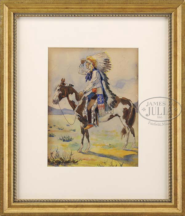 SIGNED (American, Early 20th Century) INDIAN CHIEF ON HORSEBACK. Watercolor scene shows a Native American Chief with full headdress looking toward the distance atop his brown and white horse. Signed lower right indistinctly. Housed in a modern gilt bead edge frame with white matte. SIZE: Sight: 14-1/2″ x 11-1/4″. CONDITION: A couple of small point digs and one 1/2″ tear on right margin. Some toning, otherwise good. 9-22872 (600-800)