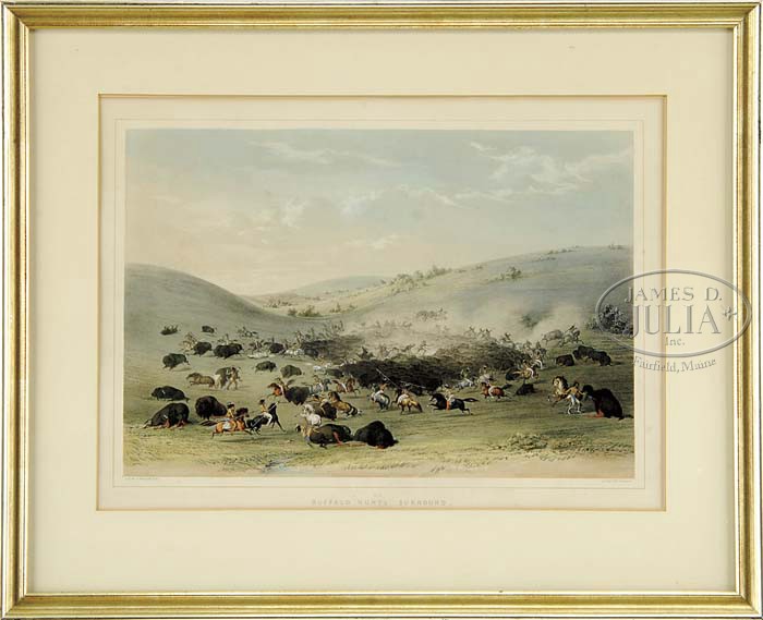 GEORGE CATLIN (American, 1796-1872) “BUFFALO HUNT, SURROUND”. No. 9 from Catlin’s North American Collection. Colored lithograph scene shows a large herd of buffalo surrounded by Indian Braves on horseback in a hilly landscape. Housed in a gilt molded wood frame with white matte. SIZE: Total paper: 17″ x 23″. Sight: 14-1/2″ x 20″. CONDITION: Examined out of frame, hinge mounted with small tear at hinged left corner, toned, otherwise very good. 9-21918-5 (1,000-2,000)