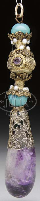 JEWELED GILT METAL MOUNTED PENDANT. Chinese, 19th century. Comprised of turquoise and seed pearls with a large amethyst drop. SIZE: 4-1/4″ l overall. CONDITION: Overall good, amethyst drops with inclusions. 9-24210-4 (200-300)