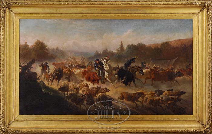 HENRY COLLINS BISPHAM (American, 1841-1882) “THE FORAGERS’ RETURN-1864”. Monumental oil on canvas scene shows a number of soldiers on horseback wielding swords, charging through a herd of cattle and sheep. Landscape scene shows a large waterfall with hills and woods, all under a blue and white cloud sky. Signed lower left and dated “1864”. Housed in its original magnificent gesso decorated wide museum quality frame. Frame retaining an original Philadelphia Academy of Fine Arts label with the alternative title “The Raid”. This is the largest Bispham painting that we have been able to locate. A history of the artist and the painting is attached to the back. SIZE: 40-1/2″ x 72″. CONDITION: Some spot inpainting and one small closed puncture. Otherwise very good. 9-93673 (50,000-70,000)
