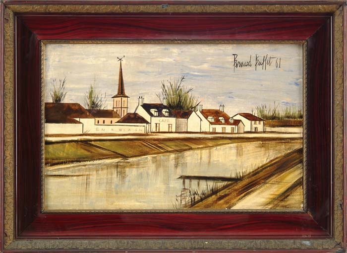 BERNARD BUFFET (French, 1928-1999) “VILLAGE AU BORD DE L’EAU 61”. Oil on board scene shows white stucco buildings in front of a canal under light blue and white sky. Signed upper right “Bernard Buffet 61” and titled on reverse. Housed in a mahogany and gesso decorated frame. SIZE: 15” x 23”. CONDITION: Very good. 9-72933 (3,000-5,000)