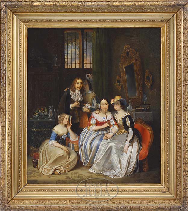 HENDRIK WILLELM CRAMER (Dutch, 1809-1874) THE BUDDING COURTSHIP. Outstanding oil on canvas interior scene shows a man being presented by family members to a young woman. He is getting advice from another man and holds a small bouquet of flowers. Another woman sits beside the girl looking away from the gentleman.A younger girl sits on an ottoman and shields her face with a fan. Above the gentleman is a double window looking out to vinery and blue with white cloud sky. The interior set with elegant furnishings. Signed lower right “Cramer”. Housed in a magnificent period gesso decorated gilt wide frame. SIZE: 26-1/2″ x 22″. CONDITION: Restored, relined. Very good. 9-95519 (2,000-3,000)