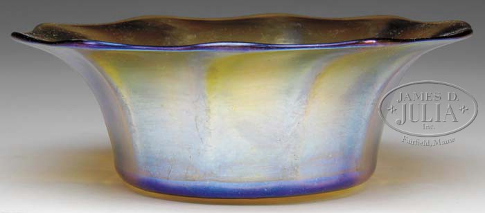 TIFFANY GOLD FAVRILE BOWL. Very nice Tiffany bowl has vertically ribbed sides leading to the flaring rim. Bowl is finished in rich gold iridescence with pink highlights and strong blue highlights at rim and foot. Signed on underside “L.C. Tiffany Favrile”. SIZE: 7-1/2″ dia. CONDITION: Very good to excellent with some very minor scratches to bottom interior. 5-63631 (600-800)