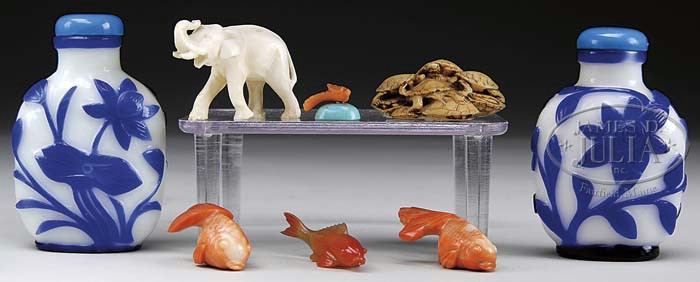 GROUP OF MISCELLANEOUS ORIENTAL ITEMS. 19-20th century. Including two blue and white cameo cut floral decorated snuff bottles; small ivory elephant; three carved fish, two of coral; miniature song bird; Carnelian and celluloid netsuke of a group of tortoises. SIZE: Bottles: 3″ h. Elephant: 1-1/4″ h. CONDITION: One snuff bottle with detached lid (still present). Otherwise all very good. 9-24087 (500-800)