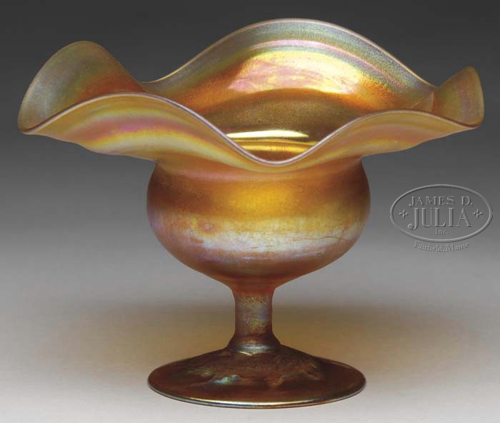 TIFFANY FLOWER FORM. Pretty Tiffany flower form vase has inverted saucer foot with widely flaring ruffled rim. Vase is finished with a rich gold iridescence showing strong highlights of blue, purple and green. Signed on the underside “LCT 2114B”. SIZE: 4″ t. CONDITION: Very good to excellent. 5-62649 (400-600)