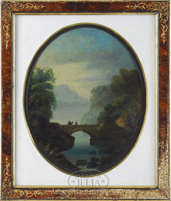 ATTRIBUTED TO THOMAS COLE (American, 1801-1848) CROSSING THE STONE BRIDGE. Unsigned oval oil on board scene shows a man leading another man on horse across an arched stone bridge which crosses a small river with tree lined banks. A tall mountain is the backdrop under gray and white sky. Board is glued to a period matte and housed in an Eastlake antique frame. SIZE: 20-1/2″ x 17-1/4″. CONDITION: Some restoration with inpainting, generally very good. 9-93060 (3,000-5,000)