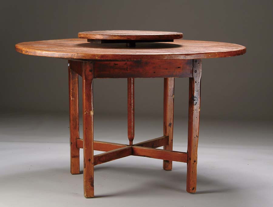 ROUND 19TH CENTURY LAZY SUSAN TABLE. This country pine table has four tapered square legs with X-stretcher. Straight apron which is wood pegged to legs. The round top supports a round lazy Susan, which has a pole that sets into cross stretcher base. Nice old finish. SIZE: 29-1/2” h x 48” dia. CONDITION: Very good. 9-26172 (600-800)