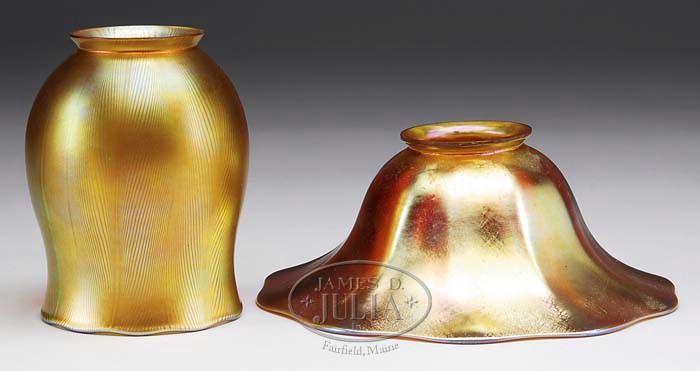 TWO ART GLASS SHADES. 1) Gold aurene glass, squat bell form. 2) Decorated classic tulip form with pulled feather decoration. SIZE: 2-3/4″ t x 7-1/4″ across and other is 5″ t. CONDITION: Both shades are very good to excellent with the bell shaped shade having a ground fitter. 5-66341 5-66463 (300-500)