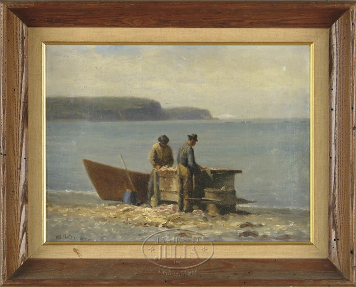 WILLIAM EDWARD NORTON (American, 1843-1916) THE FISH CLEANERS. Oil on canvas scene shows two men on beach cleaning fish with boat beside. They stand next to wooden crate/table. A harbor scene is in background with moored boats and cliff side coastline. Signed lower left “W E Norton” and identified as “Atelier”. Housed in a stained oak frame with linen and gold liner. Along with this lot are copies of biographical and exhibit information on the artist. SIZE: 12” x 16”. CONDITION: Surface grime, some areas of light scuffing, otherwise good. 9-28987 (3000-5000)