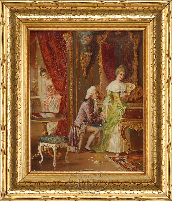 BALTHASAR SACHS (German School, 19th Century) THE PROPOSAL. Oil on wood panel interior scene shows a man on his knee proposing to a young lady in an elegant green and white dress who is holding a fan. A lavish colorful interior shows furniture, Oriental rug, mirror and a red drape having a young woman peeking at the couple. Signed bottom right “B. Sachs”. Housed in a snakeskin style decorated gilt wood frame with gilt liner. SIZE: 10″ x 8″. PROVENANCE: From the Estate of Geraldine Gaba, Scottsdale, AZ. CONDITION: Very good. 9-94816 (800-1,200)