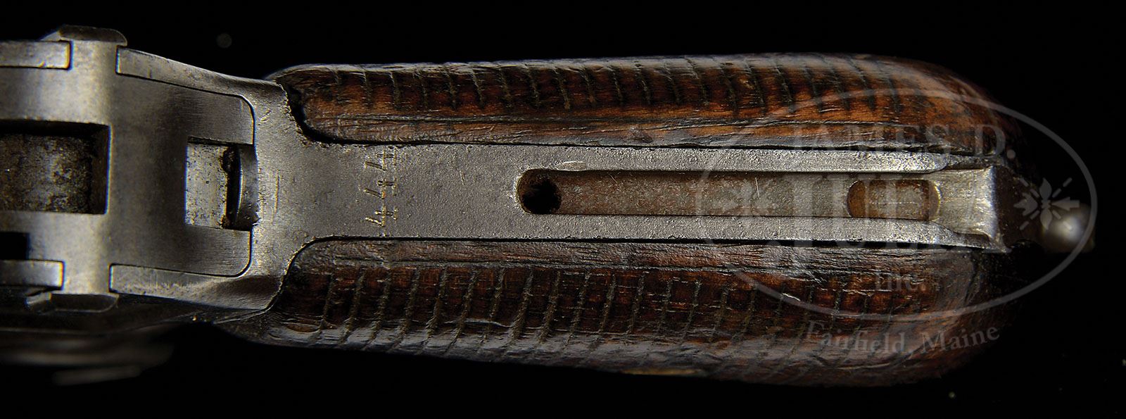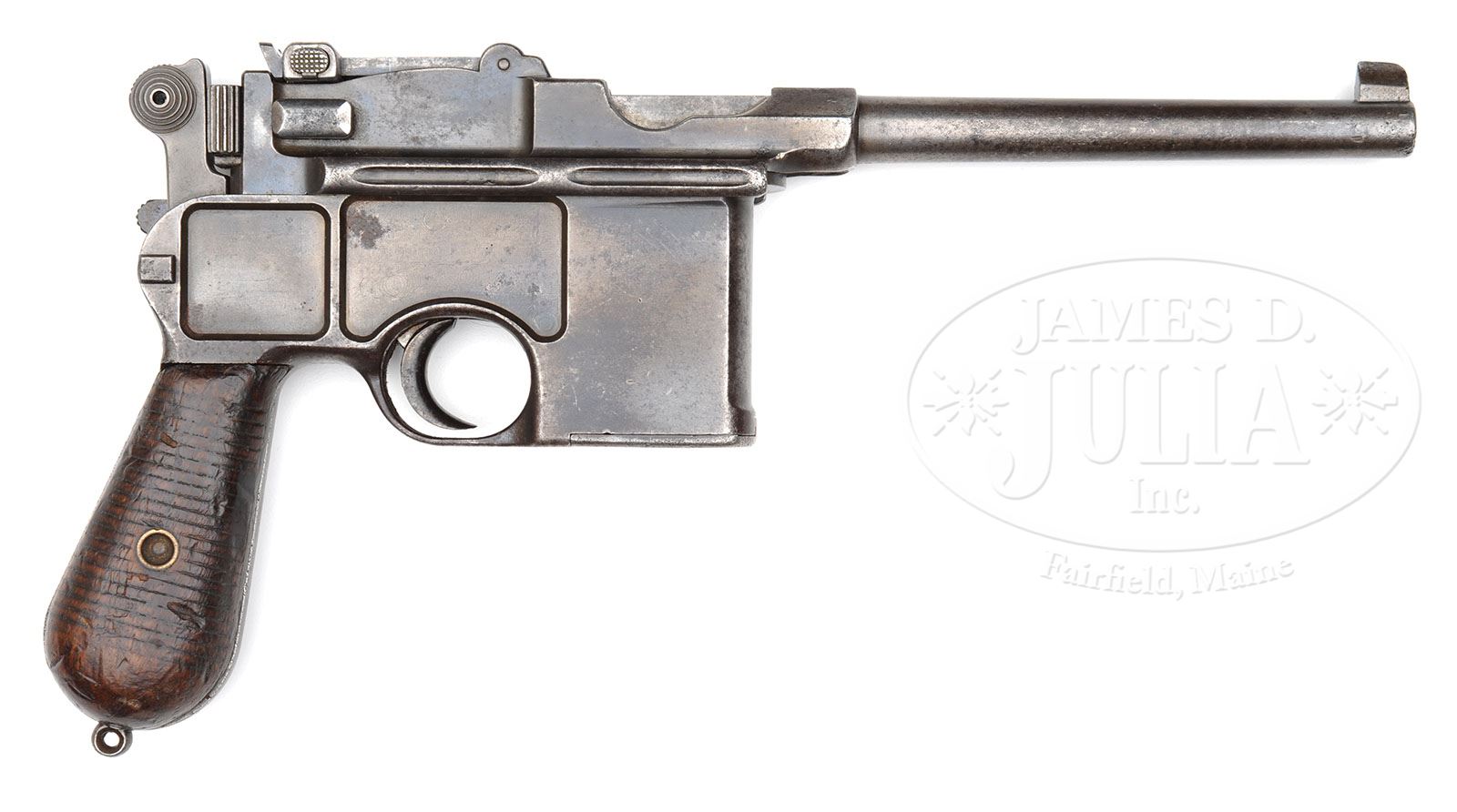 EXCEEDINGLY RARE SYSTEM MAUSER C96 WITH STEPPED BARREL. SN 444. Caliber 7.63mm. Mauser made fewer than 200 stepped bbl C96s. Though most had a serial number under 200, a small number of parts were assembled and serialized at a later date. This gun underscores that practice. It has a 5.5″ bbl and a pinned 1-10 rear sight. “System Mauser” is marked in capitals on the chamber. A Crown U was marked on the left side of the bbl extension. There are no markings on the right side or anywhere on the frame except for the serial number that appears on the backstrap just below the locking lever. As true for all Conehammers, the bolt has a long extractor and separately retained firing pin. Though most stepped bbl System Mausers had solid rails, as a later assembled example, this gun has grooved rails. The same consideration holds for the grips. Early System Mauser pistols had checkered panels. This gun, having been assembled later, has serrated grips. Normally the small parts on this pistol would have been fire blued except the trigger that would have been lightly strawed or left in the white. Detailed disassembly shows all matching parts (including the firing pin) except for the floorplate that is #417. The grips are internally stamped in “A 444” and have no recesses. PROVENANCE: Joseph J. Schroeder, Jr. Collection. CONDITION: Although the gun presents very nicely, it is a gray gun with only traces of the original blue in the protected areas of the bbl extension and inside the trigger guard. There is no remaining fire blue on any of the small parts. The grips are dark with scattered dings and wear from considerable handling. No chips or splits. System Mausers are considered the holy grail of C96 collectors and are highly sought in any condition. 4-48547 LMA31 (6,000-8,500)