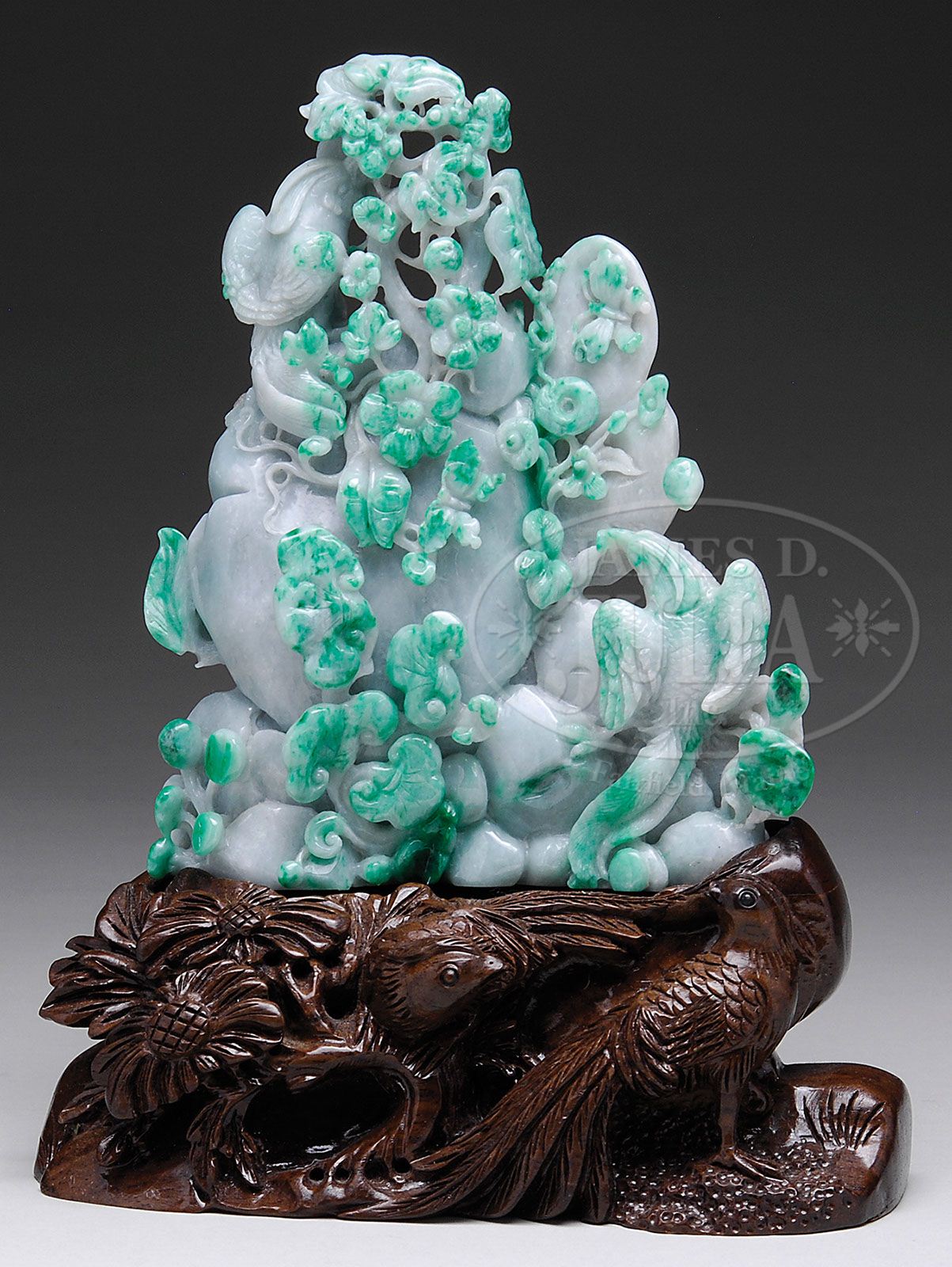 JADEITE MOUNTAIN WITH STAND. 20th century, China. Carved with lingzhi and conifers and with exotic birds on a mountainous landscape. Celadon colored stone with emerald green markings. Accompanied by floral and bird carved hardwood stand. SIZE: Jade: 7-1/2″ h x 6″ w. CONDITION: With damage and losses to rockwork beneath upper bird. Otherwise good. 7-73188 (2,200-2,500)
