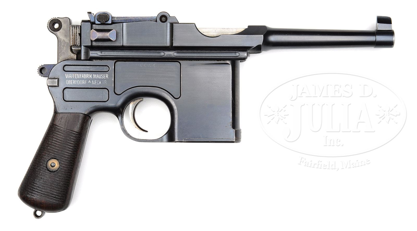 *LATE PRE-WAR BOLO IN 9MM EXPORT WITH MATCHING BOLO STOCK. SN 50204. Caliber 9mm Export. Mauser only made a few Bolos around the 50000 serial range in caliber 9mm Export. This example has a 4″ bbl and a slip-in 50-1000 rear sight. There is no chamber address. The full serial number appears on the left side of the chamber flat. A small Crown U mark is on the left side of the bbl extension. There is no marking on the right side. A standard two line address is on the right side of the frame. The matching of last three digits of the serial number are marked under the sight bar, on the bolt stop, on the bolt, hammer, subframe, and frame. This gun has a short fire blued extractor and a two lug firing pin. Fire blued small parts include the extractor, cursor, bolt stock, firing pin, safety, and grip screw. The trigger is strawed. Standard walnut grips with original finish. No lanyard ring. All matching numbers on disassembly (that shows a grooved follower) except the grips that are numbered 56. Accompanied by correct and all original Bolo stock with lug numbered 204. PROVENANCE: Joseph J. Schroeder, Jr. Collection. CONDITION: Strong 97% original blue except the front and back straps that have largely faded to a gray-brown. Comparable condition fire blue on the extractor, cursor, bolt stop, and safety, comparable condition straw on trigger. Near excellent and all original Bolo stock with scattered handling dings and dents. No cracks. Early oxidative changes on lug has transitioned the color to a gray-brown-blue. More extensive oxidation on hinge that shows minor cleaning. Solid lid with no cracks or internal modifications. It is very difficult to find an all original and matching Bolo rig, never mind an early example in 9mm Export! 4-48573 LMA17 (5,500-8,500)