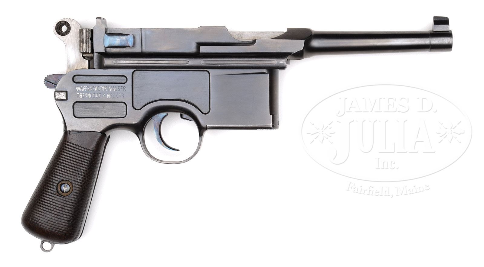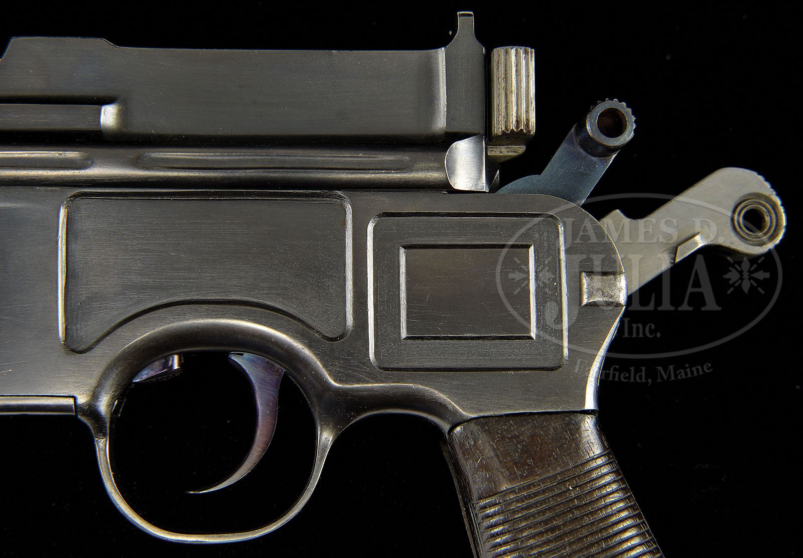 *VERY RARE C96 M1905 HAMMER SAFETY, SIX SHOT, IN 9MM EXPORT. SN 50160. Caliber 9mm Export. This extremely rare example has a 4″ bbl, a reinforced bbl extension, a fixed rear sight, and a thin backstrap that was never slotted for a shoulder stock. Usual Mauser address on the chamber and no discernible markings on either chamber flat or on either side of the bbl extension. Two line Mauser address appears on the right side of the frame. The floorplate is externally serrated to facilitate removal, accomplished by depressing a serrated button inside the trigger guard. Detailed disassembly shows a grooved follower and all matching parts though neither the bolt stop nor firing pin are numbered and some help may have been directed to matching the locking block. Each grip panel is stamped with a number 1 and the grip screw is a modern replacement. The most interesting feature relates to the hammer safety that appears as a projection extending from the left side of the hammer. If the hammer is cocked, the safety may be rotated upward to block the hammer falling. If the hammer is in the down position, rotating the safety up prevents the hammer from being cocked. Though conceptually interesting only a handful of M1905 Hammer Safety guns were ever assembled. PROVENANCE: Joseph J. Schroeder, Jr. Collection. CONDITION: A nice restoration with 98-99% of the restored blue remaining. The extractor, bolt stop, safety, trigger, and floorplate release plunger have been refurbished to a comparable condition fire blue. Mirror bore whose perfect quality suggests resleeving. Despite the refurbishment, there are so few Hammer Safety guns that the usual condition considerations should be eclipsed by its extreme rarity. 4-48572 LMA23 (5,000-6,500)