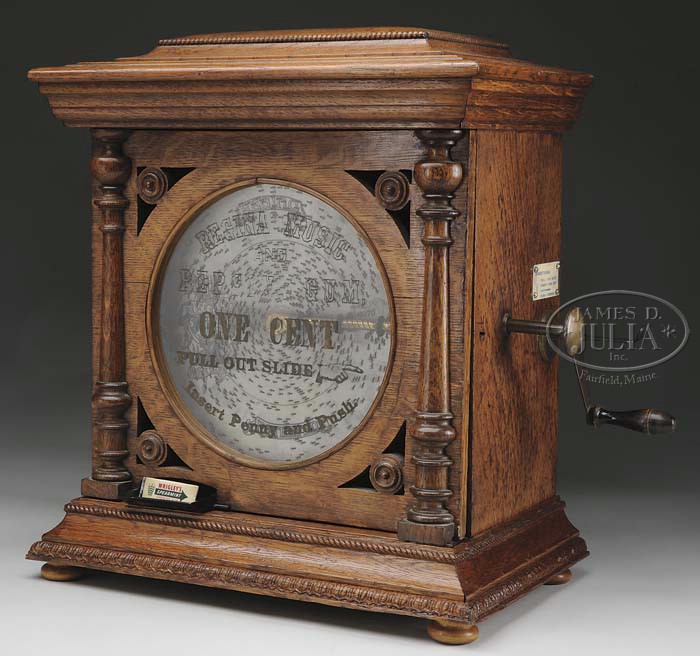 REGINA 12-1/4″ STYLE 17A MUSIC BOX WITH GUM VENDOR. Ornate oak case with original circular stenciled glass has pillow top with bead molding, heavy molding around top, nicely turned half columns on each side of front and molded base (possible professional replacement). Original crank and 10 discs present. Mechanism appears to be completely original with double comb. Coin operated by penny, user receives one tune and one piece of gum. Very nice rich tone. SIZE: 18-1/4″ w x 11-1/2″ d x 20-1/2″ h. CONDITION: Case very good overall. Back panel replaced. Original crank and coin slot and with keys to every lock. Case refinished. Few minor dings to lid. Stenciling slightly worn on top. 1-11710 (9,000-11,000) Auction: Advertising, Toy & Doll - Spring 2012 Please Note: All prices include the hammer price plus the buyer’s premium, which is paid by the buyer as part of the purchase price. The prices noted here after the auction are considered unofficial and do not become official until after the 46th day. |
