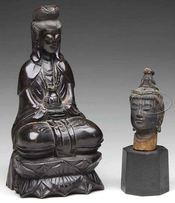 TWO ASIAN CARVED WOODEN BUDDHIST FIGURES. 18th/19th century. Including a seated figure of Quan Yin on a lotus throne together with a Japanese carved bust of a divinity. SIZE: 1) 9-1/2″ h. 2) 6-1/2″ h overall. PROVENANCE: From a fine Islesboro, Maine home. CONDITION: Very good overall with dark patina. 9-23877 (150-250)