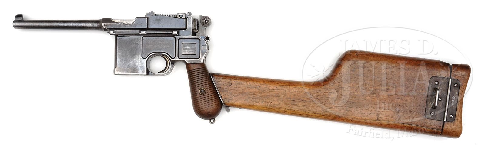 EARLY MAUSER CONEHAMMER WITH NON-REINFORCED BARREL EXTENSION AND MATCHING STOCK. SN 830. Caliber 7.63mm. Early standard production Conehammer 5.5″ bbl and pinned 1-10 rear sight. Usual chamber address. Crown U marking on the left side of the bbl extension. No marking on the right side. It has a non-reinforced bbl extension though the later frame has a raised island in the center of the rearmost recess on the left side. There are no frame markings except for the serial number on the backstrap just below the locking lever. Small parts including the extractor, cursor, bolt stop, firing pin retainer, and the safety were originally fire blued. Detailed disassembly shows all matching parts (including the firing pin) and grips that have the desirable “peanut style” recesses. No lanyard ring. Accompanied by an all original and matching shoulder stock with an unnumbered lug. The serial number was correctly applied on the upper portion of the looped hinge. PROVENANCE: Joseph J. Schroeder, Jr. Collection. CONDITION: This untouched gun has approximately 10-20% original blue in protected areas, largely the recessed area of the bbl extension and in the frame recesses. The balance is a light brown-gray. The same type of oxidative loss involved the extractor, cursor, and bolt stop. The firing pin retainer has 70% of its original fire blue. Original grips with wear consistent with the condition of the pistol. Matching stock has a 4″ repaired crack along the spine, just to the right of the hinge. There has been no wood alteration inside the lid that has no cracks. Worn bore with barely discernible rifling amidst corrosion. Perfect mechanics. A seldom encountered early production Conehammer with matching stock whose early features are sought by every collector. 4-48550 LMA36 (3,000-4,000)