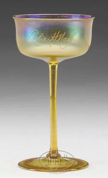 TIFFANY IRIDESCENT SHERBET. Iridescent gold sherbet with applied foot and long stem. Engraved “Leslie H. Nash” on side of cup. Signed on underside “L.C.T. Favrile”. SIZE: 6″ t. CONDITION: Very good to excellent. There is one open bubble on the side and a tooling mark around top of stem. 5-67489 (300-500)