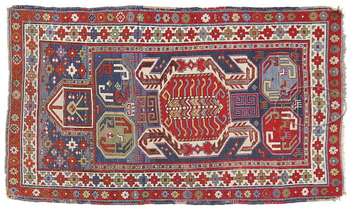 KARABAUGH ORIENTAL PRAYER RUG, NORTHWEST PERSIA. Circa 1900. The central polychrome crab medallion with dense latch hooks within secondary octagons, all within an indigo field. The borders with rows of stepped crosses and flower heads. SIZE: 5′ 5″ x 3′ 2″. PROVENANCE: From an Ellsworth, Maine Estate. CONDITION: Good with areas of wear overall. Small re-woven areas at corners. Some oxidation. Colors remain strong. 9-21934 (500-800)