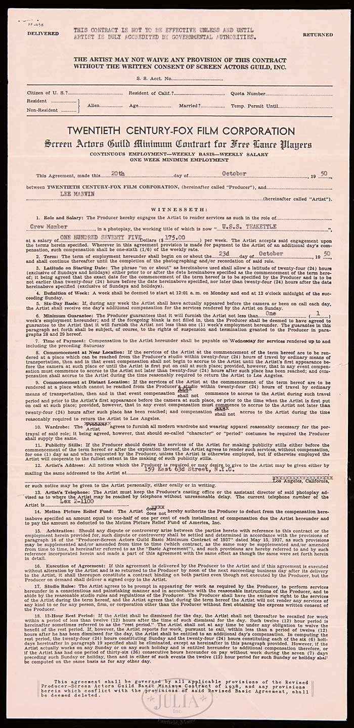 CONTRACT BETWEEN LEE MARVIN AND 20TH CENTURY FOX FOR “U.S.S. TEAKETTLE”. The pink document dated October 20th, 1950 is Lee Marvin’s first film contract. The salary of $175 per week. Signed by Lee Marvin and Joseph Waskaintz. Also with a typed slip indicating transportation, lodging and meals to be provided. SIZE: 17-1/2″ x 8-1/2″. PROVENANCE: The Estate of Lee Marvin through Pamela Marvin. CONDITION: Very good. 9-99462 (1,000-2,000)