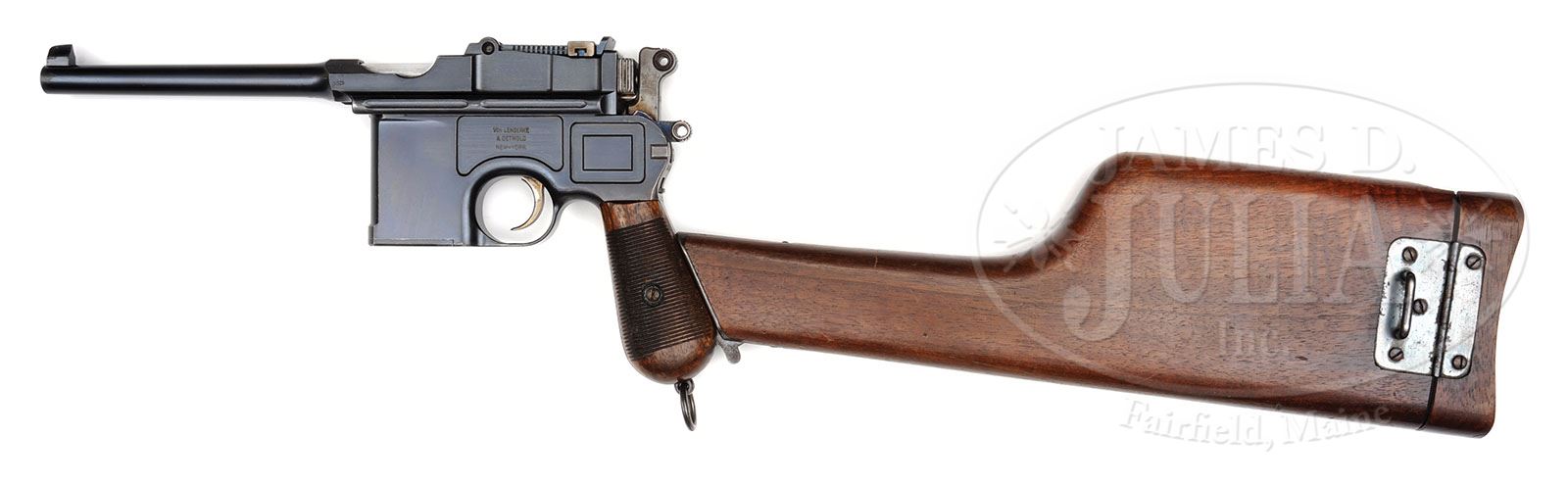 *MAUSER C96 EARLY PRE-WAR COMMERCIAL WITH MATCHING STOCK. SN 38537. Caliber 7.63mm. Early Pre-war Commercial with 5.5″ bbl and slip-in 50-1000 rear sight. Standard chamber address with serial number on left chamber flat. Crown U mark on the left side of bbl extension. Standard two line address on the right side of the frame. Imported and distributed by Von Lengerke & Detmold New York. Short extractor with two lug firing pin. Extractor, cursor, bolt stop, safety and grip screw are fire blued while the trigger is strawed. Standard walnut grips with original finish and original lanyard ring. All matching numbers including the grips that are struck with the last three digits of the serial number. Accompanied by matching shoulder stock with untouched lug marked 537. PROVENANCE: Joseph J. Schroeder, Jr. Collection. CONDITION: Bright 97% original blue with minor spotting of bbl and chamber. Usual wear along leading edge of magazine well and sharp edges where in contact with stock. Thinning of frontstrap. Mirror bore with strong rifling. Perfect mechanics. Excellent and all original shoulder stock that retains most varnish. Nearly imperceptible crack just below recess for grip. Minor patina on lug. Hinge with minimal oxidation. Lid without cracks or flaws. Overall, an excellent example of one of the earliest Pre-war Commercial pistols with comparable condition matching stock. 4-48567 LMA13 (2,000-3,000)