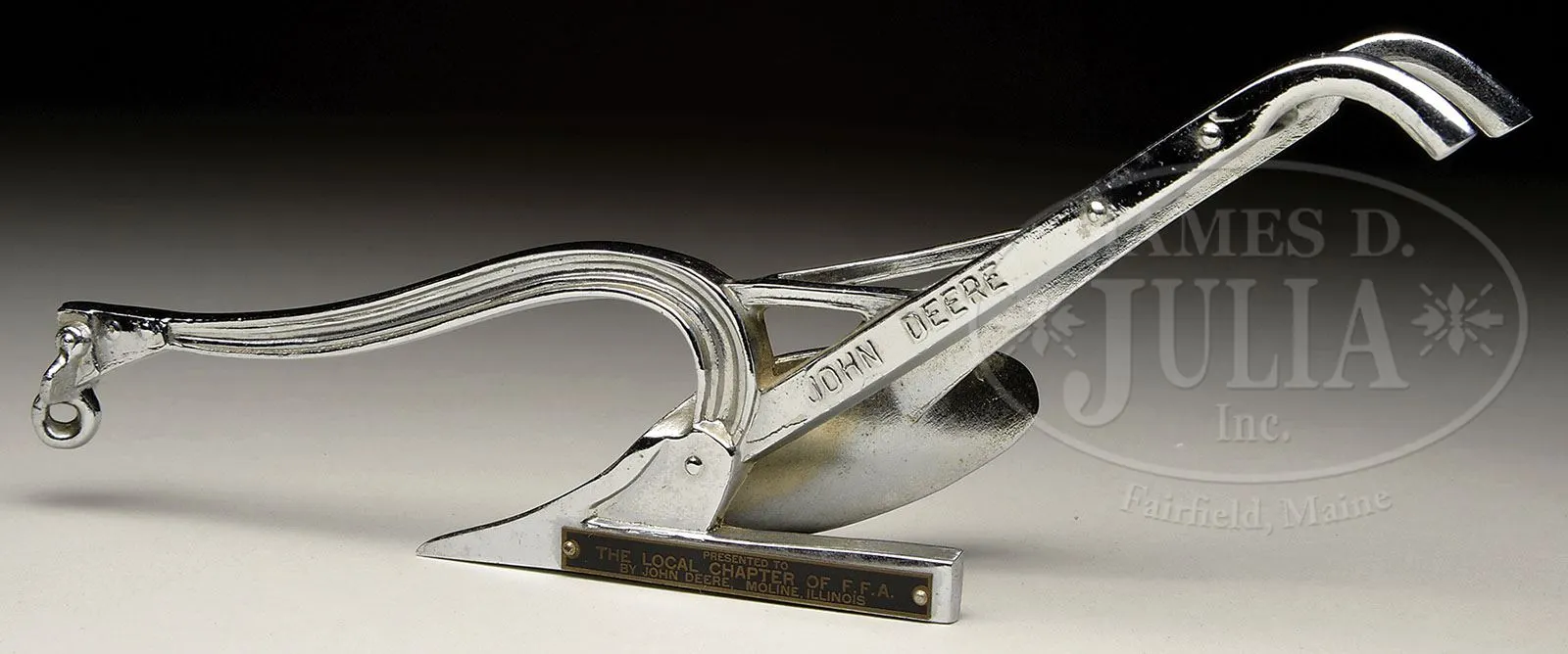 SALESMAN SAMPLE JOHN DEERE PLOW. Solid nickeled brass walk behind plow embossed “John Deere” across each handle. Base is affixed with metal plaque reading “Presented to the Local Chapter of F.F.A. by John Deere Moline, Illinois”. SIZE: 10″ l. CONDITION: Near mint. 1-13256 (800-1,200) Auction: Advertising, Toy & Doll - Fall 2013 Please Note: All prices include the hammer price plus the buyer’s premium, which is paid by the buyer as part of the purchase price. The prices noted here after the auction are considered unofficial and do not become official until after the 46th day. |