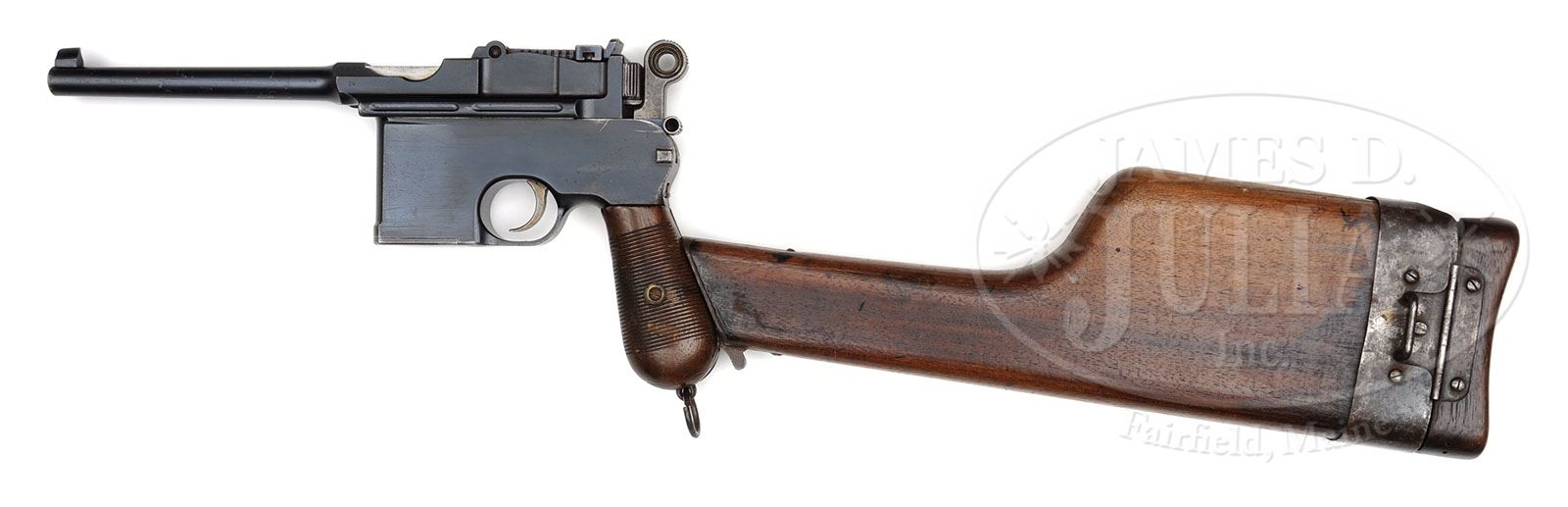 *MAUSER C96 ITALIAN NAVY FLATSIDE WITH CORRECT STOCK. SN 23336. Caliber 7.63mm. Late Italian Navy Flatside with 5.5″ bbl and slip-in 1-10 rear sight. Standard chamber address with full serial number on the left chamber flat. DV marked on the left side of the bbl extension. Crown/AV is marked under the bbl. Long extractor, single lug firing pin, large ring hammer, and thin late-style trigger. Disassembly shows an unnumbered hammer, subframe, transfer bar, and sear. The locking lever is #171. The follower and floorplate are #4928. Locking block is #336 and each grip is internally penciled with #43. Accompanied by a correct but cracked Flatside stock #742 whose body is supported with an encircling band as used in many arsenal repairs. PROVENANCE: Joseph J. Schroeder, Jr. Collection. CONDITION: This Italian Navy Flatside was obviously used and repaired as reflected by the serial numbers on the small parts. Bluing is estimated at 70% with some browning and dulling to the surface. Fresher wear under the bbl and in front of the magazine well. The front and back straps are brown and textured from handling oxidation. Bright bore with strong rifling and relatively mild frosting. Perfect mechanics. Stock has lost much of its finish and is oil stained around the lug that is numbered in the center of the upper arm consistent with replacement or renumbering. The lid, correctly recessed for the large ring hammer, has a number of small wormholes. 4-48579 LMA20 (2,000-3,000)