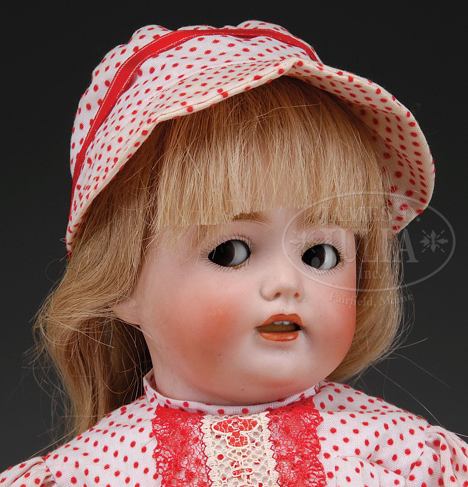 KESTNER CHARACTER CHILD. Head incised “JDK 260 Made in Germany” with brown glass eyes which both sleep and flirt from side to side attached to wire mechanism, open mouth with four upper teeth on a fully jointed so-called “Teenage” body with diagonal hip joints. She has been recostumed in a red dotted Swiss cotton dress with red lace trim and wears a dark blond human hair wig and newer cream leather shoes. SIZE: 16-1/2″ (42cm) t. CONDITION: Very good with some paint wear to hands. 1-12356 (500-800) Auction: Advertising, Toy & Doll - Fall 2012 Please Note: All prices include the hammer price plus the buyer’s premium, which is paid by the buyer as part of the purchase price. The prices noted here after the auction are considered unofficial and do not become official until after the 46th day. |