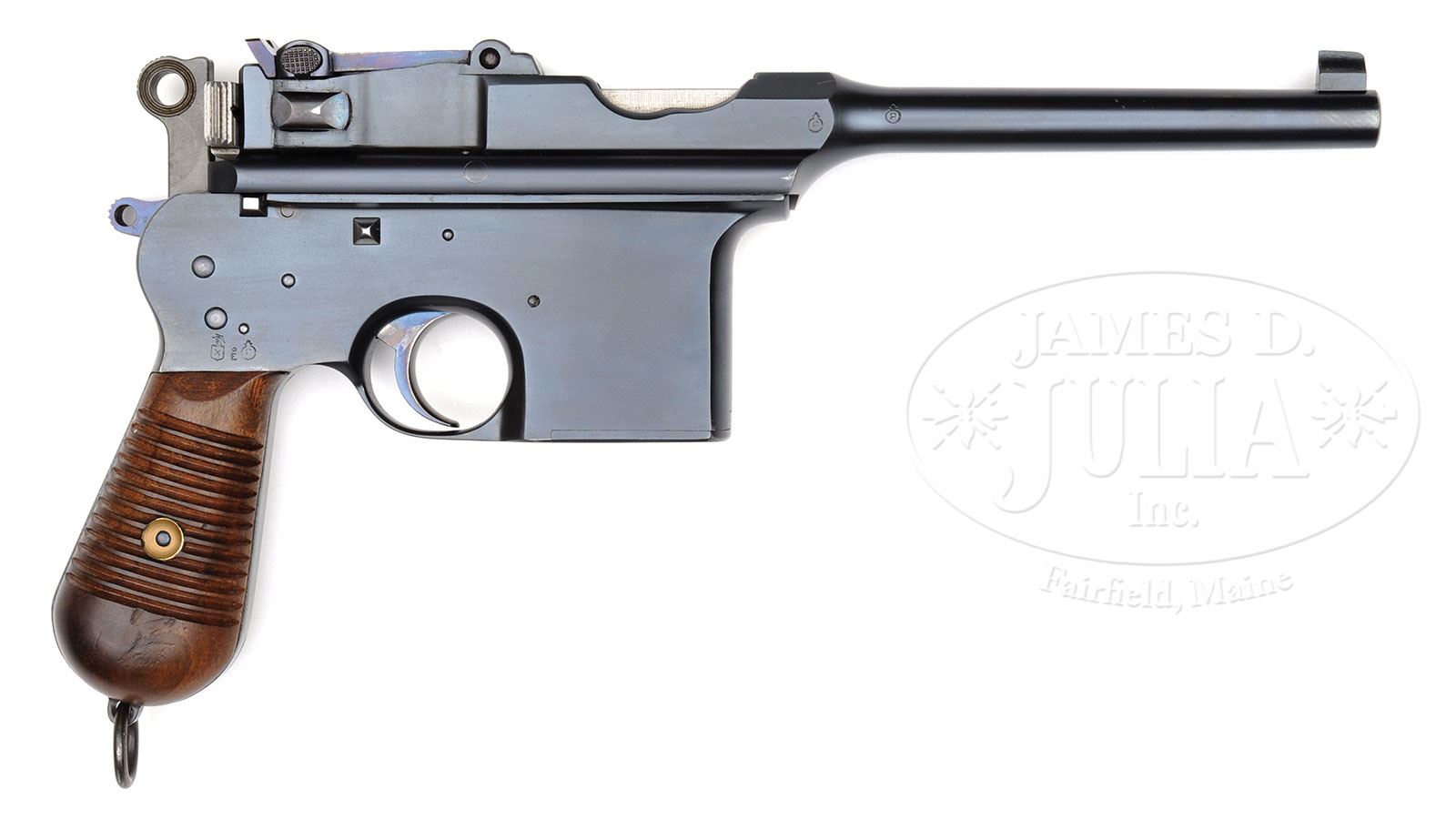 *SUPERB ASTRA M900 WITH ORIGINAL SHOULDER STOCK. SN 26421. Caliber 7.63mm. Late production Astra M900 with 5.5″ bbl, slip-in 50-1000 rear sight, large ring hammer and full size broadly serrated walnut grips. The encircled P, reflecting the Spanish automatic pistol proof, is marked on the right side of the bbl, the right side of the bbl extension and the right side of the frame next to the Eibar proof mark and the E year code 1932. The sideplate on the left side has a three line address that includes the patent date, July 12, 1928. Just above the grip is the full serial number. The short extractor, cursor, bolt stop, safety, trigger, and grip screw are fire blued. Removal of the sideplate shows matching numbers that are also stamped on each grip panel. Original lanyard ring. Perfect mirror bore and perfect mechanics. Accompanied by a superb Astra M900 shoulder stock with original rust blued hinge and fire blued lug whose last three digits are 939. A small amount of wood has been removed from inside the lid that has been renumbered 27864. PROVENANCE: Joseph J. Schroeder, Jr. Collection. CONDITION: Fantastic all original bright blue with only a few pin pricks of wear on each side of the forward rail and near the bottom of the forward magazine well. Negligible sharp edge wear on the frontstrap. The only wear on the backstrap is where it would be in contact with the shoulder stock lug. The extractor retains virtually all of its original fire blue. Only minor wear on the cursor, bolt stop, and the face/sides of the trigger. Stock appears original with fading of the upper arm of the stock lug that is otherwise unmodified. A beautiful Astra M900 rig that, despite the mismatched stock, should please the most discerning collector. 4-48509 LMA26 (2,500-3,500)