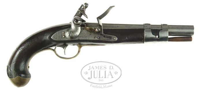NORTH MODEL 1813 FLINTLOCK MARTIAL PISTOL. Cal. 71. 8-1/2”rnd bbl. Standard “S. NORTH / BERLIN / CON” vertical markings at the rear of the lockplate. The eagle over “U. STATES” marking is in front of the hammer. The lock is a fair reconversion using some old parts. No cartouche is visible on the wood. CONDITION: Metal surfaces have been cleaned, some pitting remains. Brass has a dark patina. Stock is cleaned with some repairs at the forearm. Mechanically good. 4-57250 FS67 (3,000-4,000)