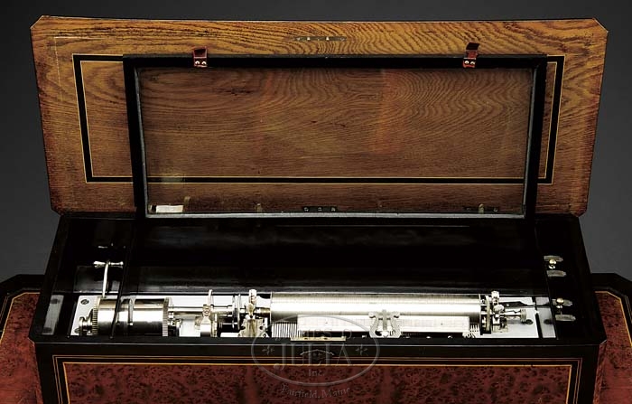 SWISS CYLINDER MUSIC BOX WITH MATCHING STAND. Circa 1878, this gorgeous interchangeable music box likely by Paillard is a single comb music box with burl and ebonized oak case. It features bells, chirping birds, and zither attachment. Matching table is on turned legs and casters and locking drawer containing 3 extra cylinders (each of which plays 8 tunes). SIZE: 35″ l x 10-1/4″ h x 15″ d. Table measures 47″ l x 25-1/2″ d x 29-1/2″ h. CONDITION: Very good to excellent with a few repaired teeth and deep rich tone. Table shows few splits to top and some wear to finish. 1-10489 (6,000-8,000) Auction: Advertising, Toy & Doll - Spring 2010 Please Note: All prices include the hammer price plus the buyer’s premium, which is paid by the buyer as part of the purchase price. The prices noted here after the auction are considered unofficial and do not become official until after the 46th day. |