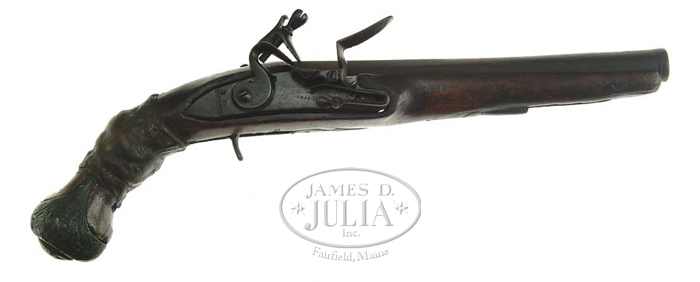 UNIDENTIFIED FLINTLOCK PISTOL. Cal. 76. 9-1/2” part oct bbl. The lockplate is marked “COME” along with other unreadable letters. The stock has been broken at the wrist and repaired with a large lump of rawhide. The trigger guard & front ramrod pipe are broken off and missing. The ramrod front lockplate screw & belt hook are missing. CONDITION: Rust brown patina with moderate rust overall. There is some corrosion in the touch hole. Small stock cracks. Needs parts to function. 4-57261 (400-800)
