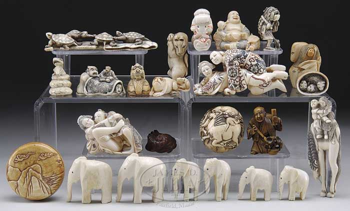 24 CARVINGS. 23 ivory netsuke and okimono of various animal and human figures together with one carved wooden netsuke carved in the shape of an abalone shell. Some signed. SIZE: 5” l largest. CONDITION: Generally good. 7-72946 (300-500)