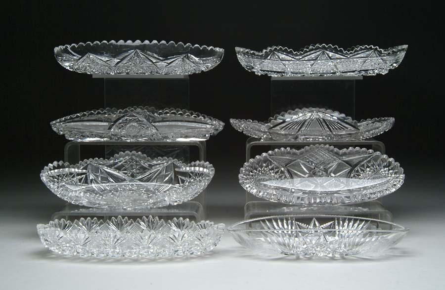 EIGHT CUT GLASS CELERY DISHES. One signed Tuthill in engraved floral and hobstar pattern, three cut in hobstar and crosshatch pattern, three cut in hobstar and cane pattern and one in single star crosshatch and fan pattern. SIZE: Range from 10-3/4 in. to 12 in. l. CONDITION: Seven have minor edge roughness, otherwise very good to excellent. Estate of Edwin Schiebel Sr. 5-60093, 5-60095 (200-400)
