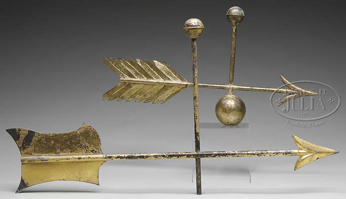 TWO ARROW WEATHERVANES. American, late 19th century. Largest with sheet copper feathers and zinc arrow head on copper rod mounted with brass ball. Second with iron arrow head and detailed notched sheet copper feathers. Copper rod with large and small copper ball. Both examples gilded. SIZE: First: 18″ h x 33-1/2″ l. Second: 13-1/2″ h x 25-1/4″ l. CONDITION: Both with losses to gilding. Feathers of each with minor creases and folds. Otherwise very good. 9-22032 (600-800)