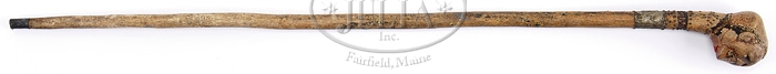 ENGLISH OR CONTINENTAL CARVED FOLK ART WALKING STICK. This carved and decorated example, possibly as early as the 18th century, rendered in a style reminiscent of the Elizabethan era. The burr grip carved in the form of a female head, applied with brass studwork in the form of a headdress. The upper shaft bound with a silvered cartouche and also decorated with brass studs. The tip with a metal band. SIZE: L 33 3/4″ CONDITION: Structurally fine with appropriate wear. The shaft surfaces originally painted or lacquered now showing only traces. Good patina. 9-97624 (200-400)