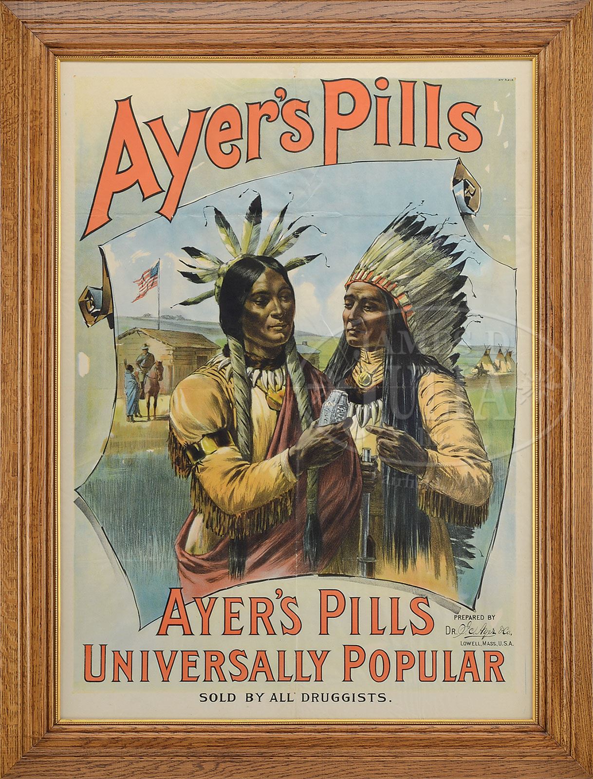 AYER’S PILLS AMERICAN INDIAN POSTER. Extremely scarce and desirable one-sheet poster with a fabulous stone lithographed illustration of Native American Indians with a bottle of Ayer’s pills as testimony to the “Universally Popular” benefits found in this Lowell, Mass. company’s preparation. SIZE: Sight size 29″ w x 41″ t. CONDITION: Very good; has had professional restoration to area of paper loss at chief’s headdress; exhibits horizontal and vertical fold creases. A great looking sign and an iconic example to emerge from the “Golden Age” of American lithography. 1-12966 (12,000-15,000) Auction: Advertising, Toy & Doll - June 2013 Please Note: All prices include the hammer price plus the buyer’s premium, which is paid by the buyer as part of the purchase price. The prices noted here after the auction are considered unofficial and do not become official until after the 46th day. |