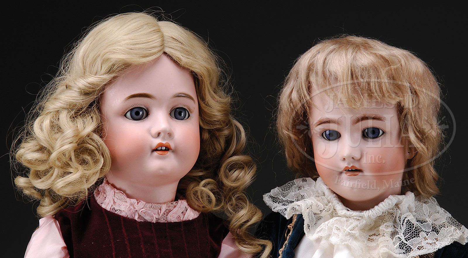 TWO GERMAN BISQUE HEAD DOLLS. 1) Incised “282 K.H. Walkure 5 1/2 Germany” with blue glass sleep eyes, open mouth with four upper teeth. She is on a modern reproduction jointed body and wears a modern blond wig. 2) Incised “Germany Heinrich Handwerck Simon & Halbig 5″ with blue glass sleep eyes, open mouth with four upper teeth, fully jointed wood and composition body. He wears an antique blond mohair wig and is dressed in a teal velvet suit with satin shirt and lace collar. SIZE: 29″ (74cm) and 28” (72cm) respectively. CONDITION: Both are very good. 1-12372 (400-600) Auction: Advertising, Toy & Doll - Fall 2012 Please Note: All prices include the hammer price plus the buyer’s premium, which is paid by the buyer as part of the purchase price. The prices noted here after the auction are considered unofficial and do not become official until after the 46th day. |