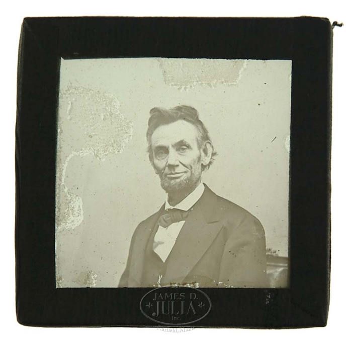MAGIC LANTERN SLIDE OF PRESIDENT ABRAHAM LINCOLN. A glass, plate slide showing the head and bust view of President Abraham Lincoln, the last known photographic view of him taken prior to his assassination. Has been stored in an old canvas case for many years. CONDITION: Fair. Some staining to slide, not affecting the image. Edges have been taped for use in a projector. 4-55093 CW103 (100-200)
