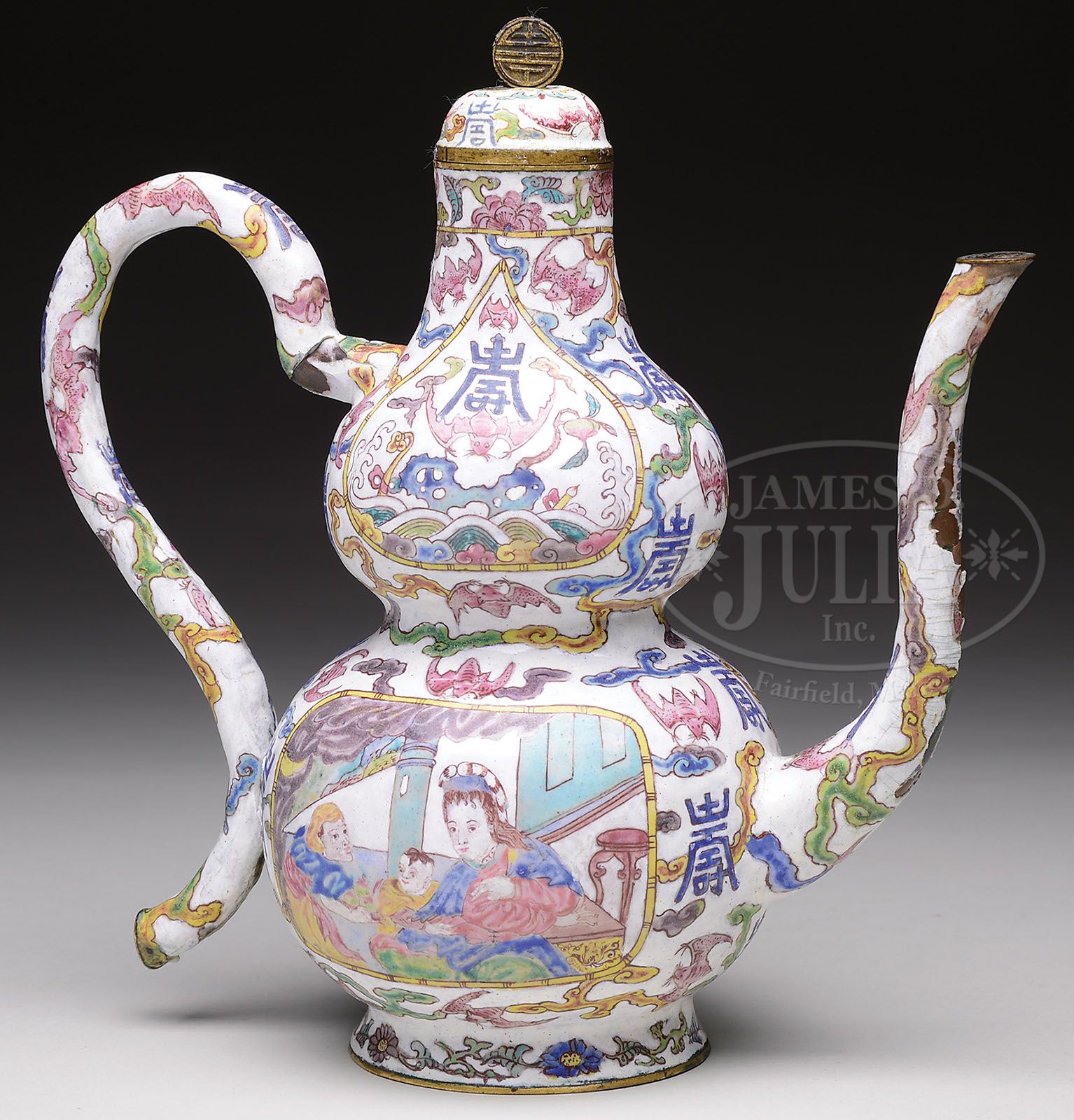 CANTON ENAMELED EWER. 19th century, China for the Thai market. Double gourd form with decoration of Thai figures in room interiors on a ground of bats and shou characters. SIZE: 9-3/4″ h. CONDITION: Considerable loss to enamel on spout, handle and cap. Otherwise fair to good. 7-73388 (100-150)