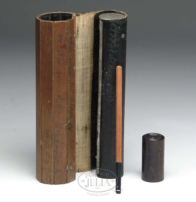 WOODEN FOLDING CIVIL WAR PERIOD CYLINDRICAL WRITING CASE. Made of slatted wood backed with tarred canvas with a tarred canvas liner, which surrounds a small tin open sided cylinder measuring 8” long x 1-1/4” in diameter. Inside the case is a small mechanical pencil marked “Eagle Pencil Co./New York,” a rosewood & glass screw tip ink well, & two cancelled two-cent Civil War period Internal Revenue stamps. Written in pencil on the outside of the wooden case is “John H. Bishop/This was made in Civil War for the war of the rebellion”. There is a John H. Bishop listed as a private in the 7th CT. Inf. CONDITION: Very good. Interior is slightly frayed at the edges. Closing hook has been lost. 4-57282 CW75 (300-400)